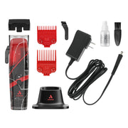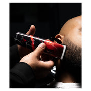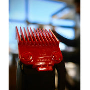 Limited-Edition Kenny Duncan Clipper, adjustable stainless-steel black Master taper blade ( 000-1) with 28-tooth ceramic cutter, two dual-magnetic red attachment combs (#0.5 - 3/32”, #1.5 - 3/16"), bonus left-hand lever arm, premium charging stand, charging adapter, blade cleaning brush, blade guard and blade oil.