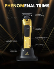 The Phenom Trimmer lives up to its namesake with every cut you make. Featuring a new brushless motor, it delivers high-speed power for precision work at 7,200 SPM. Express true personalization with special interchangeable all-metal cover and grip colorways for four color combinations. Deliver phenomenal trims with the DLC deep-tooth T-blade, and enjoy ultimate cut length versatility when paired with included attachment combs. Charge up effortlessly with the universal USB-C charging adapter or easy-release premium stand whenever, wherever.
