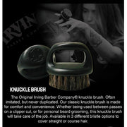 Irving Barber Company Medium/ Firm Boar Bristle Brush. This brush is great for giving a quick brush in between clipper passes, or for personal hair care. The loop design allows for cupping in the inside of the hand, wrapping around the outside of fingers to allow hand for full function while worker or simply use the loop as a handle. Also can be used for clipper cleaning brush.