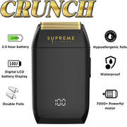 Introducing the Crunch Foil Shaver, perfect for skin fades and shaving on the head, face, and neck. Waterproof and equipped with a full kit, it's designed to handle any job with ease. Ideal for barbers or for traveling.