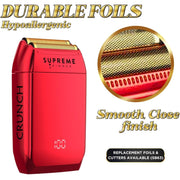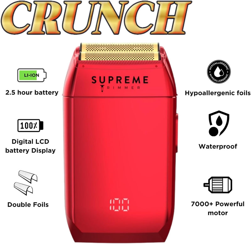 Introducing the Crunch Foil Shaver, perfect for skin fades and shaving on the head, face, and neck. Waterproof and equipped with a full kit, it's designed to handle any job with ease. Ideal for barbers or for traveling.