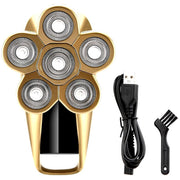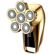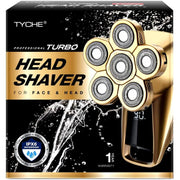 Tyche 6 Blades Head Shaver presents an electric razor with an LED display. This innovative product is IPX6 waterproof, contains washable blades, USB-charging, and has an ergonomic handle for efficient use and smooth results.