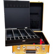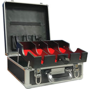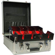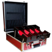Includes removable compartment. Elevating and tilting clipper tray with red fabric lining. Hard back briefcase style. Ideal for professionals who work on location. Easy cleanup to protect and ensure pristine tools. Available in gold, black, red, and silver.
