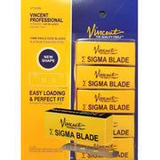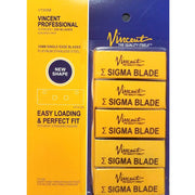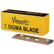 Experience a close, smooth shave with the Vincent Sigma Blade, featuring a 35mm single edge platinum coated stainless steel blade. Each blade is precision engineered with holes to secure it firmly in place, ensuring durability and longevity. This pack contains 250 blades, presented in 10 packs of 25, compatible with most razors that use the standard 45mm snap blade. Ideal for adult men's personal grooming, these blades are designed for unisex use and are available in a sleek gray color.