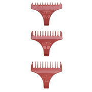 The T Wide Trimmer Guides are cutting guides for the T Wide blade (#2215), specifically on the Wahl Professional 5 Star Detailer #8081, #8412 Retro T-Cut, and 8163 Cordless Detailer. Guides measure 1/16”, 1/8”, and 3/16”. Red in color.