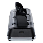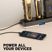 Safely charging three cord/cordless 5V Wahl Professional tools at the same speed of charging a single tool, the Wahl Professional Power Station takes charging to a whole new level. With six interchangeable tool inserts, barbers can display and charge any combination of Wahl cordless clippers, trimmers, and shavers. The USB-C charging port allows Pros to charge mobile and payment devices. With a space-saving cord design, the weighted Power Station can be flush against a wall for maximum workspace and minimal clutter.