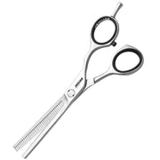 The Silver Line CJ 40 Plus thinning shears have an offset design with an ergonomic handle for relaxed working. These shears feature 40 thinning teeth with fine V-teeth serration for a pleasantly smooth, precise cut. The angled thumb ring helps to provide a relaxed working posture without pressure marks.