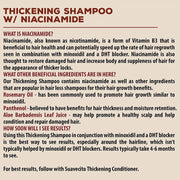 Our Thickening Shampoo contains niacinamide as well as other ingredients that are popular in hair loss shampoos for their hair growth benefits. Rosemary oil has been commonly used to promote hair growth similar to minoxidil. Panthenol is believed to have benefits for hair thickness and moisture retention. Aloe Barbadensis Leaf Juice aloe may help promote a healthy scalp and help condition and repair damaged hair, keeping your follicles clean and healthy.