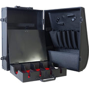 The hard shell backpack combines the style of our master case with the convenience of a backpack. This backpack is designed to show style and function. With the backpack opened vertically on any table you can easily access your tools. Features a removable insert tray and elastic straps for your shears and combs. Deep pockets for your clippers and trimmers, and a large pocket that can hold your blow dryer and bottles. The straps and latches promote/enhance breathability and security when you travel.