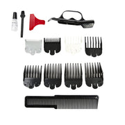 • Accessories : 8 attachment combs (1/16" - 1"), clipper finger ring, styling comb, oil, cleaning brush, styling comb, instructions and red blade guard