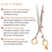 The convex blades are designed to provide smooth, effortless cutting by using the expert Centrix honing techniques. The offset handle provides a relaxed "open hand" grip for low stress cutting and improved cutting speed. The tension screw is specifically designed to extend the life of the blade while being easily adjustable for each haircut.
