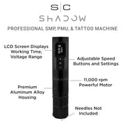 Introducing the Shadow Professional SMP, PMU, & Tattoo Machine, a pinnacle of craftsmanship in the world of body art. Precision-engineered from high-quality aluminum alloy, this machine is designed for professionals who demand excellence.