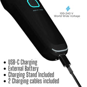 Introducing the RECHARGE Trimmer - power your Barber game with versatility! Charge three different ways and never miss a trim thanks to its rechargeable external battery, ensuring your style stays sharp whenever, wherever.